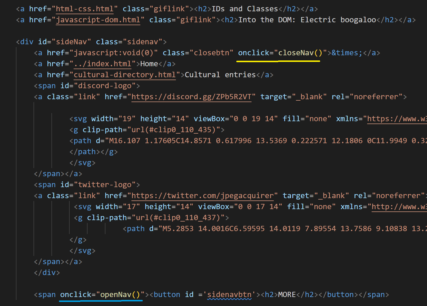 Underlined are the javascript functions where if a user interacts with the button by clicking it, triggers the function.